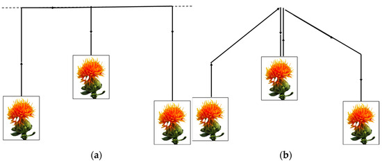 Safflower (Carthamus tinctorius L.), indigenous to the eastern Mediterranean, emerges as a versatile cash crop, extensively cultivated for its applications as a medicinal herb, in oil production, for dyes, and as fodder, showcasing remarkable adaptability along with tolerance to cold and heat [1,2]. The harvesting period of safflower primarily spans from July to August, characterized by the asynchronous maturation of safflower filaments, necessitating the selective harvesting of safflower [3,4]. After reaching maturity, within a timeframe of 1–3 days, the water content in safflower filaments diminishes, rendering them dry and brittle. This transformation complicates the harvesting process and precipitates a degradation in the quality of the harvested safflower. It is therefore imperative to complete the safflower harvesting before the filaments become overly desiccated and brittle. Safflower harvesting operations primarily target the collection of mature filaments at the top of the flower heads. A single safflower plant has from four to ten flower heads, arranged in a conical spatial pattern, mainly concentrated at the top of the plant. During the flowering period, safflower capitula progressively blooms from the top of the main stem toward the tops of the peripheral branches. Consequently, optimizing the efficiency of safflower-harvesting robots becomes a critical endeavor [5,6].