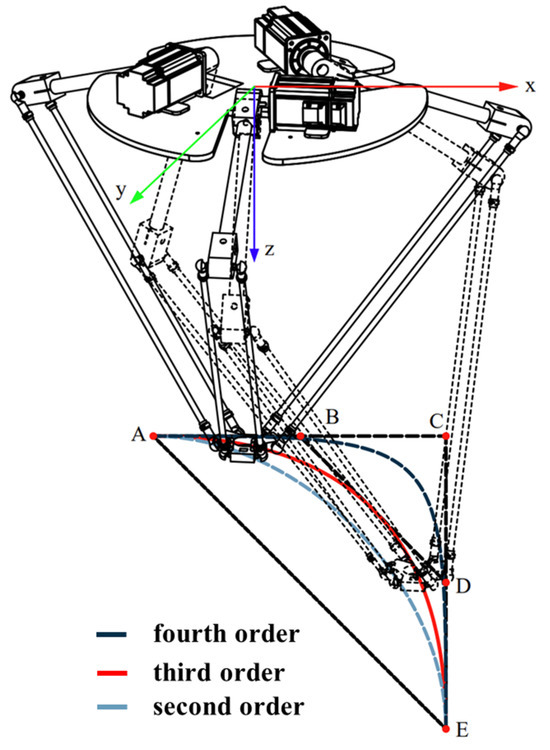 Bezier curve. where xyz is the static platform coordinate system, A, C, E are second-order Bessel curve reference points, A, B, D, E are third-order Bessel curve reference points, and A, B, C, D, E are fourth-order Bessel curve reference points.
