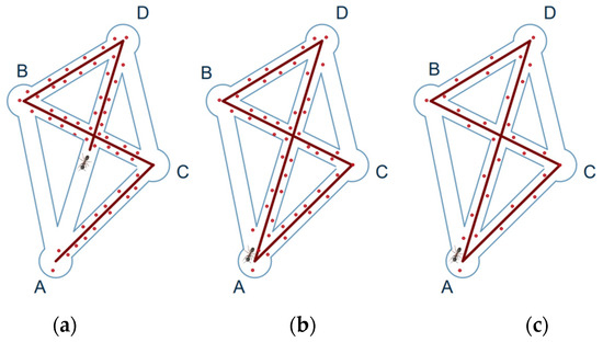 Adaptive schematic: (a) ants release pheromones; (b) smaller values of; (c) larger values of. Where A, B, C and D are path points that require trajectory planning.