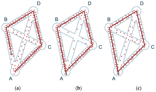Schematic diagram of restriction pheromone: (a) ants release pheromone; (b) no limiting pheromone; (c) limiting pheromone. Where A, B, C and D are path points that require trajectory planning.