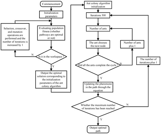 Through the iterations of the above genetic algorithm, the optimal solutions for the uncertain parameters of the ant colony algorithm can be identified. These solutions are then incorporated into the ant colony algorithm to enhance its efficiency. The flowchart of the ant colony genetic algorithm is illustrated in Figure 11.