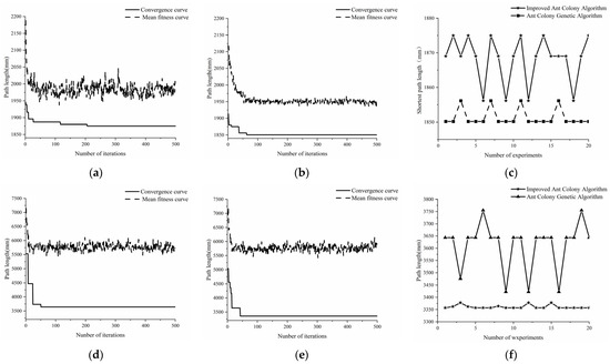 Algorithm optimization results. (a) Iteration curve of the improved ant colony algorithm based on 15 safflower flowers; (b) Iteration curve of the ant colony genetic algorithm based on 15 safflower flowers; (c) Lengths of 20 optimized paths based on 15 safflower flowers; (d) Iteration curve of the improved ant colony algorithm based on 30 safflower flowers; (e) Iteration curve of the ant colony genetic algorithm based on 30 safflower flowers; (f) Lengths of 20 optimized paths based on 30 safflower flowers.