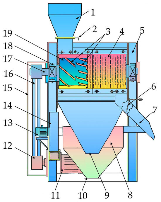- Li, W.L.; Dai, F.; Shi, R.J.; Yuan, Z.X.; Zhao, Y.M.; Liu, X.Q.; Pan, H.F.; Deng, H.; Xu, P.Q. A Centrifugal Impact Type Flaxseed Dehuller. China Patent CN217609385U, 21 October 2022. [Google Scholar]