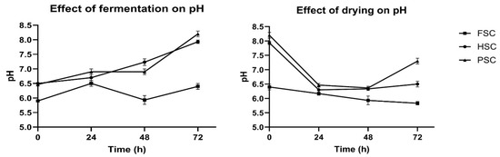 As fermentation progressed, there was a shift toward alkalinity, with final pH levels reaching 7.9 and 8.2 for HSC and PSC. In contrast, the pH remained slightly acidic for FSC, measuring 6.4 at the end of fermentation. For HSC, the pH increased during fermentation, showing an alkalinization trend, while for PSC, alkalinization started only after 48 h of fermentation; finally, for FSC, a slower acidification was observed in the first 48 h of fermentation, followed by a slightly rise in pH toward 6.4. After drying, the pH returned to its initial slightly acidic state for HSC and FSC, suggesting the volatilization of alkaline compounds that increased the pH during fermentation. On the other hand, PSC maintained a slight elevation above the baseline pH, measured at 7.3.