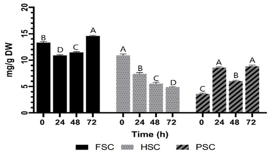As shown in Figure 2, for FSC, reducing sugar content initially decreased from 1.33% in the first 24 h to 1.09%, followed by a subsequent increase to 1.46% at 72 h. For HSC, sugars were predominantly consumed, showing a decline from 1.09% to 0.55%. On the other hand, the PSC exhibited an increase in reducing sugar concentration, rising from 0.36% to 0.86% at 24 h, followed by a further increase to 0.89% at the end of fermentation.