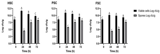 In this case, Bacillus licheniformis growth and spore formation exhibited consistency through all examined samples, as demonstrated in Figure 3. Initial count increased in the first 24 h of fermentation from initial 8.57 log cfu/g up to 11.66, 10.97, and 10.17 log cfu/g for HSC, PSC, and FSC, respectively (p < 0.05), following a declining phase until the end of fermentation, which was accompanied by an increased spore formation (not determined for T0). Viability reached the lowest point at 72 h of fermentation for all samples, measuring 9.80, 9.47, and 9.32 log cfu/g for HSC, PSC, and FSC (p < 0.05). Sporulation rate (%) relative to total viable counts progressed over time (24 h, 48 h, and 72 h), with a rising trend, as follows: from 39.21% and 71.78% to 84.92% for HSC; from 52.99% and 72.19% to 86.36% for PSC; and from 43.60% and 51.61% to 82.26% for FSC (p < 0.05). As HSC and PSC displayed an approx. similar pattern, FSC rose from 43.60% to 51.61% in the first 48 h and rapidly surged to 82.26%.