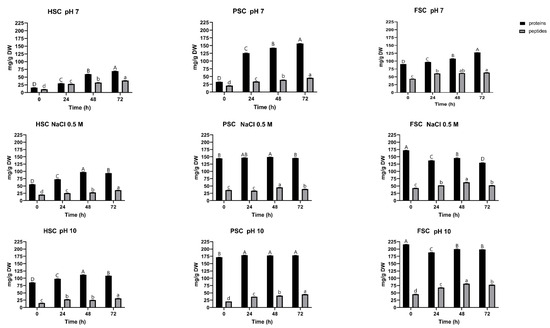 As illustrated in Figure 4, this study indicates a significant improvement in water protein solubility over time due to fermentation (p < 0.05) for HSC and FSC, and most notably for PSC, where an approx. 4.8-fold increase was observed after 72 h. Water-soluble protein content (mg/g) increased from 15.87 ± 0.61 to 69.40 ± 1.06 for HSC, from 90.44 ± 0.33 to 127.64 ± 0.67 for FSC, and from 32.46 ± 0.70 to 156.56 ± 0.57 for PSC. Peptide yield, due to Bacillus licheniformis’ enzymatic activity, increased in the same manner, improving peptide content (mg/g) from 10.62 ± 0.53 to 38.99 ± 0.67 for HSC, 43.73 ± 0.33 to 63.45 ± 0.67 for FSC, and 20.96 ± 0.25 to 45.48 ± 0.88 for PSC.