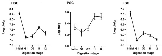 In this study, we employed a simulation to consider multiple factors and their interactions simultaneously, rather than isolating them individually, with the viability outcome on different digestion stages, as illustrated in Figure 5. In the first hour of gastric stage, a decline in viability of about 1 log cfu/g was observed for HSC and FSC due to acidic conditions, and 0.12 log cfu/g for PSC. A modest rise in viability from G1 to G2 was observed across all samples, although statistical significance was only noted for FSC (p < 0.05). This indicates adaptability to the medium conditions, particularly noticeable in the case of FSC. Transitioning to the intestinal (I1) phase of digestion resulted in a rise in total count by 0.35 and 0.22 log cfu/g for HSC and PSC, respectively. In contrast, there was a small decrease of 0.11 log cfu/g observed for FSC. This decreasing trend persisted in the I2 stage and was particularly significant for HSC and FSC (0.22 log cfu/g, 0.17 log cfu/g, respectively), probably attributable to the presence of bile salts. PSC, in contrast, showed signs of reaching a stationary phase. Despite the modest microbial dynamics observed, Bacillus spores demonstrated resilience across the studied conditions. Survivability rate accounted for 90.2%, 101.5%, and 85.72% for HSC, PSC, and FSC when compared to initial counts before simulation.
