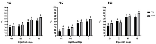 Figure 6. Changes in digestibility (%) during digestion stages. Bars represent the mean SD. The use of distinct uppercase letters in the graph corresponds to the results of Tukey’s post hoc comparisons. These comparisons highlight differences in digestibility (%) between unfermented samples (T0) and fermented samples (T72) across the same stages of digestion.