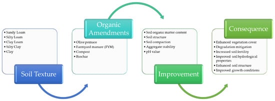 For this review, we extensively searched all published reviews, meta-analyses, and research articles on the available databases that had been published up until 31 December 2023. Our search terms included “soil amendments”, “organic amendments”, “biochar”, “compost”, “vermicompost”, “manure”, “dung”, and “pomace”, combined with “soil”, “soil organic matter”, “water erosion”, “soil quality”, “land degradation”, “tillage”, “soil management”, and other keywords related to land degradation and soil restoration strategies. We only included articles written in English and those that included replicated treatments and control treatments without the use of organic amendments for comparison purposes. The statistical results reported in the published articles were used to draw statistical conclusions about the amendments’ impacts. Note that a few relevant articles in this review did not provide statistical changes or numerical differences in the improvement of soil properties, only general statements about the impact of the amendments on some qualitative services (i.e., soil quality, structure improvement, soil fertility, etc.). This review focuses on the most relevant amendment-induced changes in soil systems and land degradation reclamation, and discusses how organic amendments affect agricultural production.