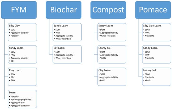 Specific soil property improvements in specific soil textures after several organic amendment applications. Abbreviations: SOM—soil organic matter, PAW—plant available water, BD—bulk density.