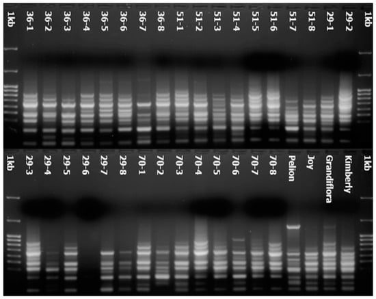 Gel electrophoresis pattern of the amplification products of the 32 seed-derived genotypes [36 (1→8), 51 (1→8), 29 (1→8) and 70 (1→8)] of G. jasminoides and the 4 reference cultivars (‘Pelion’, ‘Joy’, ‘Grandiflora’ and ‘Kimberly’) using the primer UBC 834. The sizes of the amplified bands were calculated using a 1 kb DNA ladder (200–3000 bp).
