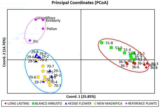 Principal coordinate analysis (PCoA) based on combined data from 10 ISSR and 2 SCoT primers for the thirty-two genotypes of G. jasminoides, derived from seeds of the four cultivars (‘Long Lasting’ and ‘Blanco Arbusto’ from the USA and ‘Hedge Flower’ and ‘New Magnifica’ from Australia), and the four reference cultivars (‘Pelion’, ‘Joy’, ‘Grandiflora’ and ‘Kimberly’).