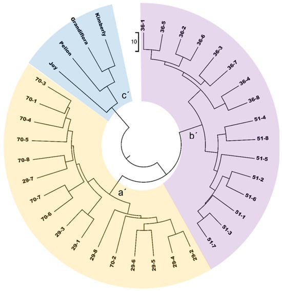 Similar results were observed in the form of a dendrogram, in which the thirty-two genotypes and the four reference cultivars were grouped into three clusters. The first cluster (a’) included the 16 genotypes that originated from Australia, whereas the second one (b’) included the 16 genotypes from the USA. The third smallest cluster (c’) consisted of the reference cultivars (Figure 3).