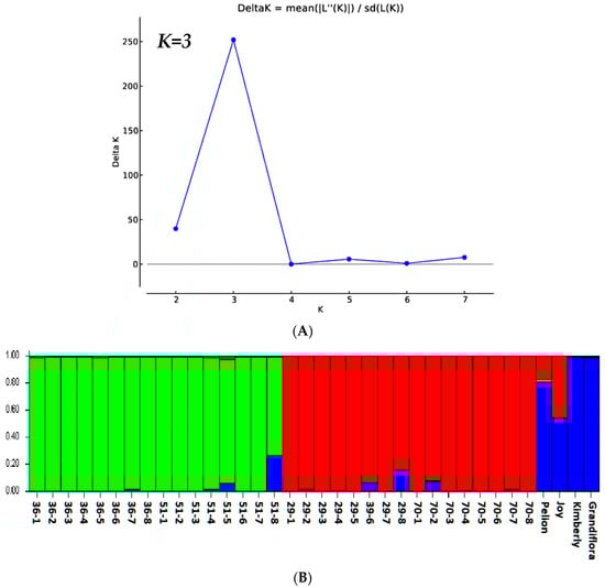 STRUCTURE analysis of the data of the 32 seed-derived gardenia genotypes and the 4 reference cultivars based on 10 ISSR and 2 SCoT primers, with K = 3 clusters: (A) estimation of the number of populations for K by calculating ΔK values (higher value for ΔK = 3); (Β) each column of the STRUCTURE analysis indicates 1 of the 36 genotypes. In green are the 8 genotypes (36-1→8) from ‘Long Lasting’ and the 8 genotypes (51-1→8) from ‘Blanco Arbusto’ (both from the USA); in red are the 8 genotypes (29-1→8) from ‘Hedge Flower’ and the 8 genotypes (70-1→8) from ‘New Magnifica’ (both from Australia); and in blue are the 4 reference cultivars.