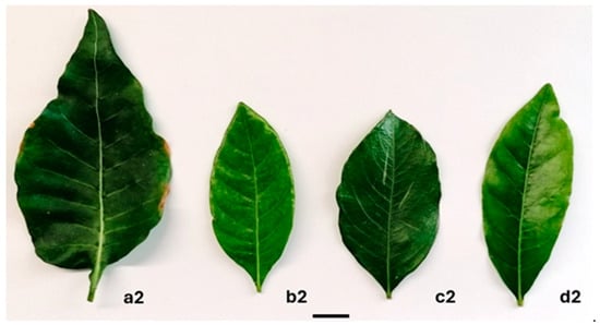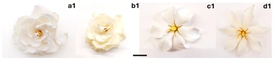 Morphological variation in flowers [(a1) G. jasminoides ‘Grandiflora’; (b1) G. jasminoides ‘Pelion’; (c1) G. jasminoides genotype 51-8; (d1) G. jasminoides genotype 29-5] and mature leaves [(a2) G. jasminoides ‘Grandiflora’; (b2) G. jasminoides ‘Pelion’; (c2) G. jasminoides genotype 51-8; (d2) G. jasminoides genotype 29-5] of some G. jasminoides Ellis genotypes used in this study. The black horizontal lines in the images correspond to a length of 1 cm.