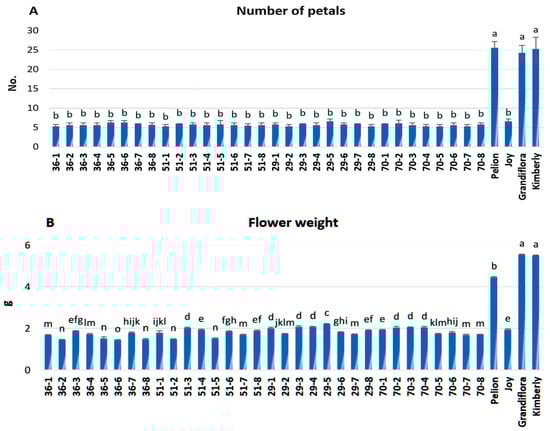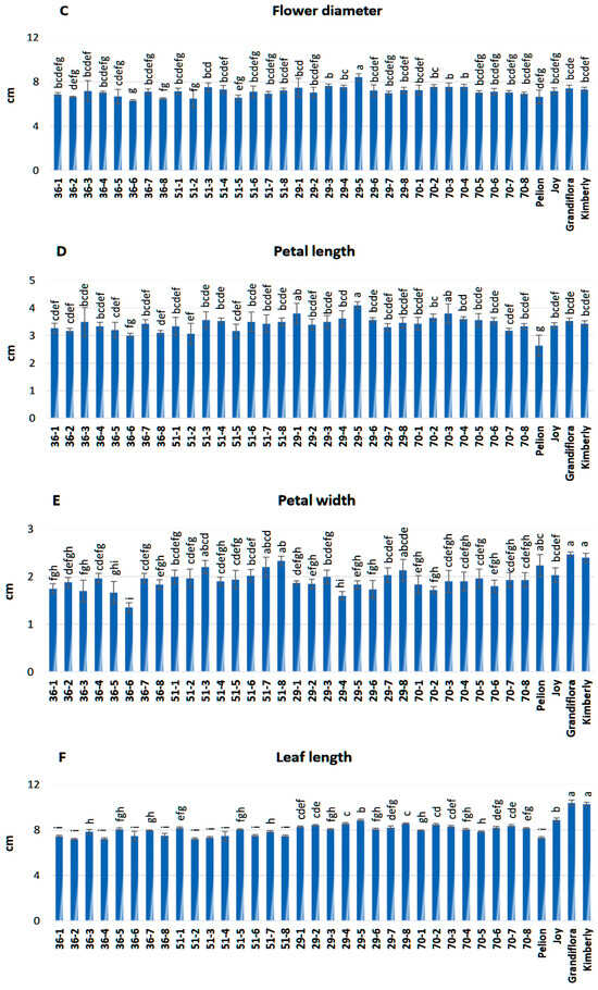 According to the morphological analysis of the traits, significant variation was observed among the thirty-two genotypes examined and the four reference cultivars regarding the flower form, flower weight and number of petals (Figure 5 and Figure 6A,B, Table S3). The reference cultivars, except ‘Joy’, had double flowers and, therefore, had more petals, numbering up to 25. In addition, ‘Grandiflora’ and ‘Kimberly’ recorded the highest values for flower weight, which were 5.55 g and 5.51 g, respectively (Figure 6B, Table S3). On the other hand, single-flowered genotypes were found to have 5-7 petals (Figure 6A, Table S3). The highest values for both the number of petals and the weight of the flowers were observed in genotype 29-5, whose flowers had 6.67 petals and weighed 2.22 g (Figure 6A,B, Table S3). Genotype 29-5 also had the largest flower diameter, which was 8.40 cm (Figure 6C, Table S3). As for the dimensions of the petals, the lengths varied from 2.63 to 4.10 cm and the widths from 1.35 to 2.47 cm (Figure 6D,E, Table S3). Genotype 29-5 appears to have the longest petals (4.10 cm) and ‘Grandiflora’ and ‘Kimberly’ the widest (2.47 and 2.40 cm, respectively), whereas genotype 36-6 had the narrowest petals (1.35 cm) (Figure 6D,E, Table S3). The lengths of the leaves ranged from 7.18 to 10.38 cm and the widths from 2.37 to 5.47 cm (Figure 6F,G, Table S3). The largest leaves, in terms of length and width, were recorded in the cultivars ‘Grandiflora’ and ‘Kimberly’ (Figure 5 and Figure 6F,G, Table S3). Among the 32 genotypes derived from seeds, genotype 29-5 had the longest leaf, and genotype 51-8 had the widest leaf (Figure 5 and Figure 6F,G, Table S3). On the basis of the results, of the thirty-two genotypes derived from seeds, the one with the overall best morphological traits appears to be genotype 29-5. In addition, genotype 29-5 scored the highest values for flower diameter and weight and petal length, as well as leaf length, desirable commercial traits that make it a potential genotype for cultivation as a pot plant or for ornamental use. Some other genotypes derived from seeds in this study can be exploited for specific uses; for example, genotype 36-6 could be used for the production of miniature potted plants due to its small leaves and flowers, as well as its small canopy size.