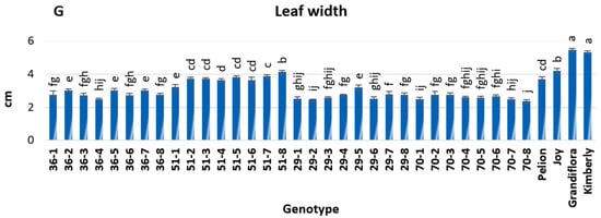 Mean values of seven morphological traits of ornamental interest [(A) Number of petals, (B) Flower weight (g), (C) Flower diameter (cm), (D) Petal length (cm), (E) Petal width (cm), (F) Leaf length (cm) and (G) Leaf width (cm)] measured in the 32 seed-derived genotypes and the 4 reference cultivars of G. jasminoides. Different letters in the columns, for each of the traits, indicate statistically significant differences among the genotypes, according to Tukey’s multiple comparison test, at p < 0.05. The error bars indicate standard deviation (SD).
