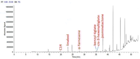 Gardenia flower petal extracts were obtained using the n-hexane solvent, following the Rusanov et al. [] method with some modifications. In particular, 0.6 g of petals, stored at −80 °C, was ground into powder and homogenized in liquid nitrogen using a porcelain mortar and pestle and then transferred to a 4 mL glass vial. The extraction was performed by adding 1.8 mL of n-hexane to glass vials containing 2.5 μg/mL of tetradecane (C-14), as an internal standard for GC-MS analysis. Each glass vial was subjected to an extensive vortex for 3 h and 30 min, at 2000 rpm, at room temperature. After dehydration with 500 mg anhydrous sodium sulfate, the vortex continued for an additional 15 min to remove the remaining water. The samples were then centrifuged at 3500 rpm at 5 °C for 10 min. Finally, 1.5 mL of the supernatant was transferred to a 2 mL glass vial through a 0.22 μm hydrophobic PTFE syringe filter, followed by storage at −20 °C until chemical analysis.
