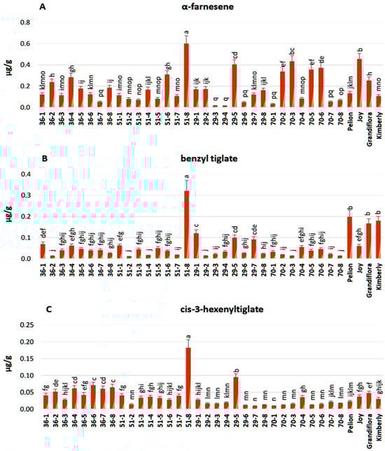 A total of 12 compounds were identified in the flower extracts of the thirty-two genotypes derived from seeds of G. jasminoides, as well as the four reference cultivars. The identified volatile compounds were α-farnesene, benzyl benzoate, benzyl tiglate, cis-3-hexenyltiglate, cis-3-hexenyl benzoate, guaiol jasminelactone, linalool, n-heptacosane, n-pentacosane, tetradecane and tricosane. Among them, α-farnesene, benzyl tiglate, cis-3-hexenyltiglate, jasminelactone and linalool were the most abundant. The highest values for the above volatile compounds were recorded in genotype 51-8, which significantly differed from all other genotypes (Figure 7 and Figure 8, Table S4). Sorting them in descending order, jasminelactone accounted for 1.605 μg/g, linalool for 0.664 μg/g, α-farnesene for 0.602 μg/g, benzyl tiglate for 0.321 μg/g and cis-3-hexenyltiglate for 0.182 μg/g (Figure 8, Table S4). The lowest values for cis-3-hexenyltiglate were observed in genotypes 29-7 and 70-1 (Figure 8C, Table S4) and for linalool in genotype 51-4 (Figure 8E, Table S4). Genotype 29-3 scored the lowest values for α-farnesene, benzyl tiglate and jasminelactone (Figure 8A,B,D, Table S4).