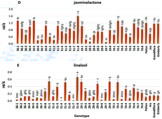 Mean values of the major volatile compounds of flower petals [(A) α-farnesene, (B) benzyl tiglate, (C) cis-3-hexenyltiglate, (D) jasminelactone and (E) linalool (μg/g)] identified with GC-MS in the 32 seed-derived genotypes and the 4 reference cultivars of G. jasminoides. The different letters in the columns, for each of the volatile compounds, indicate statistically significant differences among the genotypes, according to Tukey’s multiple comparison test, at p < 0.05. The error bars indicate the standard deviation (SD).