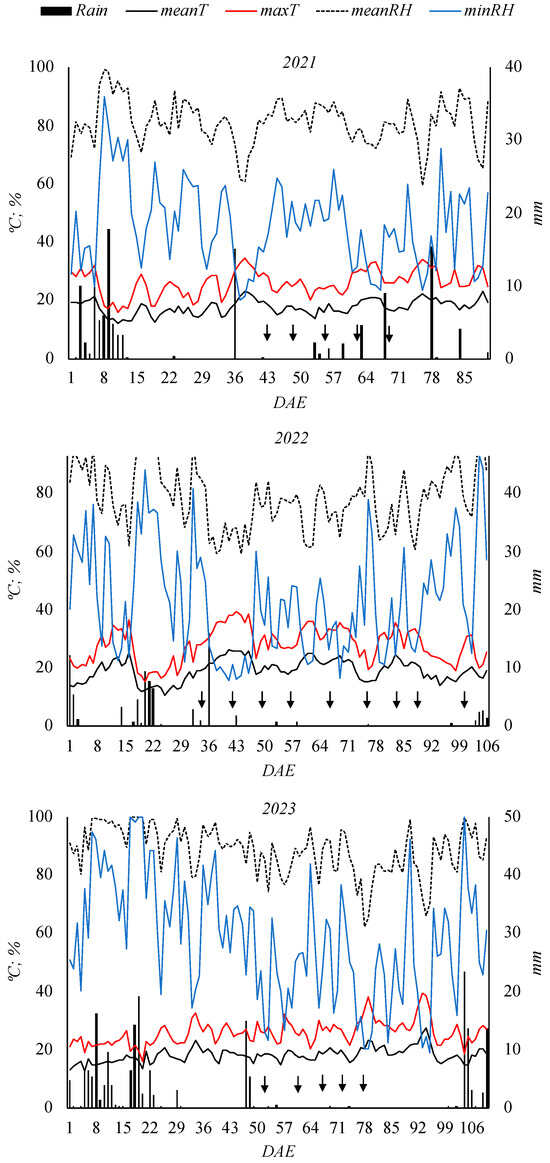 Daily weather conditions during three crop seasons (2021, 2022 and 2023). The black arrow represents the amount of water supplied on days when sprinkler irrigation was applied. DAE: days after of emergence.