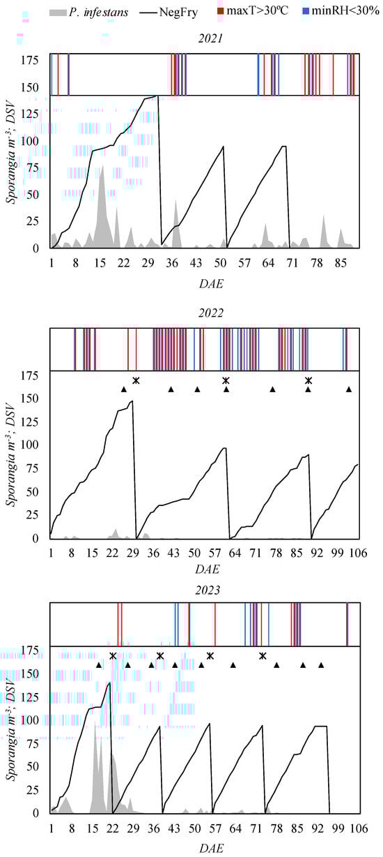 The weakness of the original DSS is its adjustment to the environmental conditions of the application area. Hermansen and Amundsen [] showed promising results for late blight control by combining at least two DSSs, timing the first application according to the negative forecast of NEGFRY and the subsequent application according to Førsund’s rules. The results of the present study showed that the DSS continued to predict late blight risk in A Limia in July and August, despite unfavourable environmental conditions for late blight, low concentration of air sporangia recorded and first symptoms. However, NEGFRY successfully predicted the first treatment (two of the three seasons) coinciding with an increase in the number of sporangia. During the 2023 growing season, the DSS recommended the first application when slight symptoms of late blight in the field were observed. On another occasion, the model continued to accumulate risk units, giving 2–3 unnecessary warnings until the crop senesced (specifically, 36 DAE in 2021 and 58 DAE in 2023). Similar conclusions were found in Brazil; the DSS tested recommended between four and eight unnecessary applications []. According to the literature, the main cause is the high temperatures during the day combined with dry conditions and lack of rainfall. It is generally accepted that there is no disease progress at temperatures above 28–29 °C [,,]. Temperatures above 30 °C slow or stop the growth of the fungus in the field, but do not kill it; the fungus can start sporulating again when the temperature becomes favourable and RH is sufficiently high []. A 30-minute exposure to dry weather with RH between 50% and 60% causes the cessation of sporangial activity, and if this dry weather continues, disease development will be limited. However, the disease can still develop if the crop canopy is sufficiently developed to generate a microclimate that allows sporulation and germination []. In present study, the 2022 crop season was a very hot year, with many days with meteorological conditions unfavourable for late blight. These unfavourable days were counted a week after the emergence of the crop, coinciding with a crop cycle with little presence of sporangia in the environment. Consequently, during the 2022 season, NEGFRY proposed three alerts. In this sense, meteorological conditions play a determining role in late blight epidemics during a crop cycle. Hence the importance of environmental condition monitoring during the development of the disease [,,,].