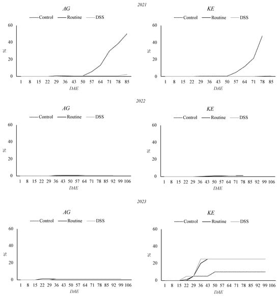 In 2023, onset of the first symptoms was similar in the three strategies tested for both potato varieties. It was also the growing season in which symptoms were observed earliest, at 22 DAE (Table 1). In the 2021 and 2022 growing seasons, the day of first symptoms was variable, but in both years, this day varied by only one week. In 2021, the Control was the first strategy to show symptoms on the 29th day in KE and AG. However, in DSS the first symptoms on 36 DAE were observed. In 2022, in most strategies the first symptoms appeared on 36 DAE, except in KE Routine, which started on 43 DAE.