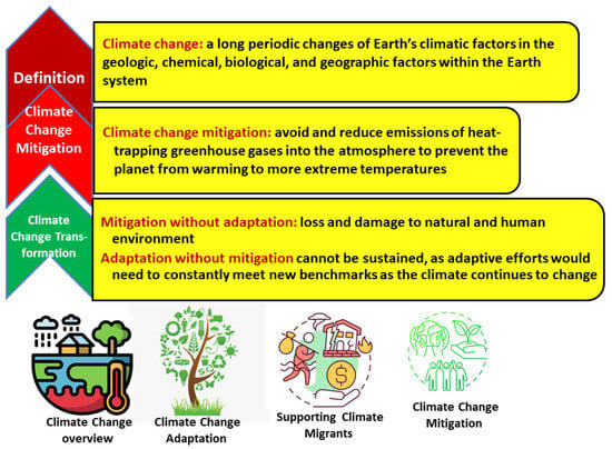 The definitions of major terms associated with climate change [1] (free images from https://www.flaticon.com/icons, accessed on 22 September 2023).