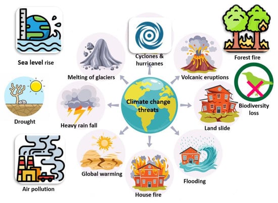 Different threats that can be caused by climate change [47,48] (free images from https://www.flaticon.com/icons, accessed on 22 September 2023).