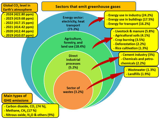 Global sectors that generate greenhouse gases (GHGs) and how much they contribute to GHG emissions [60] (source: https://www.co2.earth/, accessed on 10 February 2024).