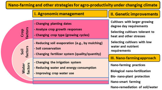 Nano-farming approaches and other strategies can be considered for agro-productivity under the changing climate through the following targets: (1) reducing agricultural production losses under climate change and heat stress, (2) ensuring food security under changing climate and socio-economic environments, and (3) reducing the adaptation consequences to water and energy resources. Several farming activities are dependent on climatic elements that can threaten local and global food security [105]. Therefore, maintaining agricultural productivity under climate change is a critical need that can be achieved through strategies such as (i) agronomic management (depending on soil, water, and crop factors), (ii) crop genetic improvements to create tolerance to heat and other stresses, and (iii) nano-farming approaches (Figure 4; [105]).