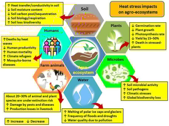 Impacts of heat stress on different agroecosystem components [48,109,110].