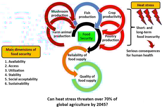 Food security is defined as follows: “food security is achieved when all people, at all times, have physical and economic access to sufficient, safe and nutritious food to meet their dietary needs and food preferences for an active and healthy life” [121]. Increased heat waves linked to climate change threaten global food security over both the short and long term (Figure 6; [121,122,123,124]). Society has a major challenge in providing sufficient, nutritious, affordable, and safe food for the global population. Food security was identified as a key issue by organizations like the United Nations FAO [121] during the World Food Summit in 1996. This challenge is still relevant due to ongoing global climate change, degradation of water and land resources, biodiversity loss, and food wastage, which all contribute to food insecurity [125]. Research has addressed several dimensions of food security, including food availability, access to food, utilization and stability of the food systems, and social acceptability of food sources (e.g., [122,123,126]). Global food security is under threat due to factors such as pollution [127,128], drought, and heat stresses [129,130]. Minimizing food waste and proper food management are other important factors in food security [131]. Heat stress impacts food security as it affects wild plant, fish, and animal production, as well as crop, aquiculture, and farm animal production. Studies have documented the negative impacts of heat stress on rice [132], fish [133], and farm animal [20] productivity, respectively. Other examples include “No farmer no food” [134], the interaction between food production and climate change [135], decreased cucurbits production in North Africa due to heat stress [136], decreased salmon production under future climate change [137], food and water insecurity [138], and global agri-food trade under climate change [139]. Food production includes food processing, transport, sorting, and disposal of food wastes [135].