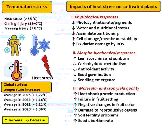 Plant responses to heat stress. The direction of the arrows indicates the positive or negative effects of heat stress on the given plant processes within each of the boxes. Global surface temperature increases are relative to the 20th century average [145].