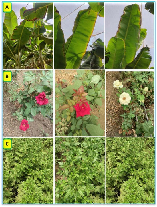 Heat stress on new banana leaves (photos in group (A)), heat stress in rose plants causing deformation of the flowers as a result of a decrease in the number of petals (photos in group (B)), and heat stress on Chrysanthemum morifolium plants, which prevents flowering by causing abscission of flower buds (photos in group (C)). These stress symptoms were observed after a period with air temperatures of 45 °C (measured in the shade) during the summer of 2023 in Egypt (photos by M. El-Mahrouk).