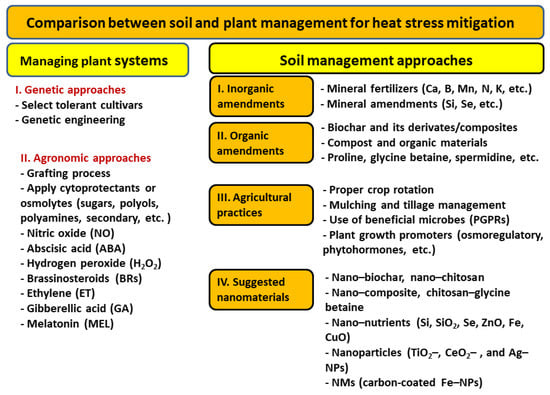 Many management practices may be used to prevent heat stress in plants. These include traditional methods such as temporary shading to protect crops from excessive sun exposure during heat waves, sufficient watering, particularly spraying, applying mulch to reduce soil temperatures and conserve water, and using heat-resistant crop cultivars [18]. Agrivoltaics, the production of crops and/or livestock beneath solar panels, has also shown promise to reduce the impacts of heat stress on crops and animals due to the shading effect of the solar panels and modification of the microclimate under the panels [199,200,201]. Approaches to mitigate heat stress can be grouped into (1) agronomic management, (2) genetic improvement, and (3) nano-farming (Figure 9; [17,30,141,162]). Plants can prepare for heat stress by thermo-priming or by protecting themselves from as much damage as possible by thermotolerance. Agronomic strategies include crop factors (earlier planting dates, analyzing crop growth responses, and changing the crop type or growing cycles), soil factors (reducing soil evaporation by mulching, soil conservation with amendments, and changing the fertilizer system), and water factors (hanging irrigation systems, reducing water and energy consumption, and improving crop water use and water productivity) [105].