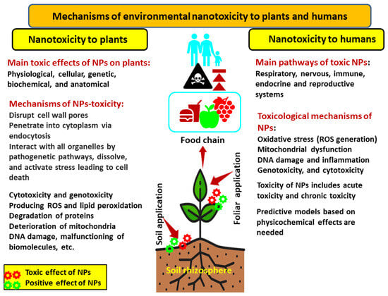 Mechanisms of nanotoxicity for both plants and humans. Nanotoxicity starts with the application of nanomaterials on soil and plants, which introduces NPs to the food chain and then to humans [104,217,224,225,227] (free image from https://www.freepik.com/premium-vector/plant-soil-growth-agriculture-color-line-icon_40823886.htm, accessed on 10 February 2024.