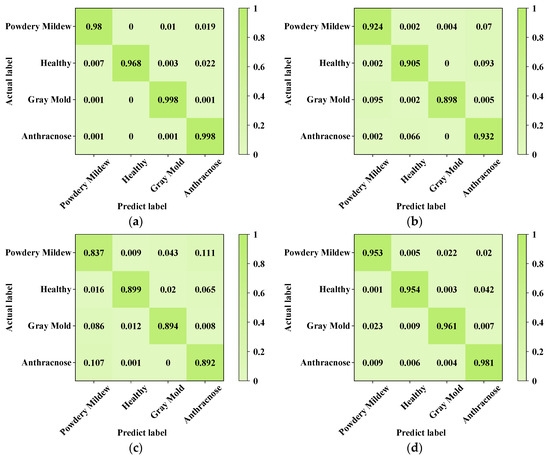 The confusion matrix, as depicted in Figure 14, outlines the recognition results, with rows indicating predicted categories and columns showing actual categories. Diagonal elements represent the likelihood of accurately identifying disease classifications, while off-diagonal elements reflect the chances of misclassification. The confusion matrix demonstrates that BerryNet-Lite achieves greater accuracy in identifying diverse disease classifications compared to other models. This observation strongly supports the efficacy of BerryNet-Lite in strawberry disease recognition.