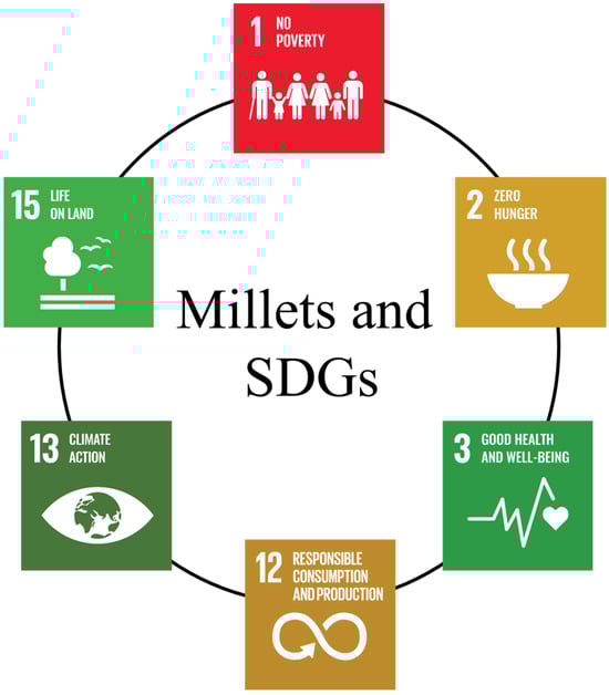 Millets are a group of small-seeded cereal crops grown largely on marginal dry lands or with limited access to irrigation. There are several millet species cultivated worldwide, such as sorghum (Sorghum bicolor), pearl millet (Cenchrus americanus), finger millet (Eleusine coracona), foxtail millet (Setaria italica), proso millet (Panicum miliaceum), little millet (Panicum sumatrense), kodo millet (Paspalum scrobiculatum), barnyard millet (Echinochloa esculenta), brown top millet (Urochloa ramosa), tef (Eragrostis tef), fonio millet (Digitaria exilis), job’s tear (Coix lacryma-jobi), guinea millet (Brachiaria deflexa), raishan (Digitaria cruciate), etc. Millets are generally called gluten-free and are highly nutritious and contain higher protein, minerals, vitamins, and fiber compared to major cereal crops, rice (Oryza sativa), wheat (Triticum aestivum), and maize (Zea mays) [1]. Millets can grow with less water than most other major cereals and are well suited to drought-like conditions [2]. Millets’ production traditionally does not depend on artificial fertilizers, and most are unaffected by storage pests [3]. In addition, millets have natural biodiversity that makes them suitable for cultivation in various agro-climatic conditions [4]. They have a short lifecycle and can be grown between main cropping seasons and enrich the soil with their micronutrients [5]. The affordability of millets also makes it the “poor man’s food grain” [6]. The world is now looking at millets for their enormous potential. In addition to the cultivation advantages of millets, they are highly nutritious and climate-resilient. Because of this, mainstream society is beginning to understand and appreciate the long-term benefits of millets. Millets are a nutritional powerhouse, and they are now referred to as “Nutri-Cereals” [7]. They are rich in protein, fiber, key vitamins, and mineral sources. About 80% of millets have long been an important part of a nourishing diet [8]. Millets are high in fiber, which aids digestion and prevents constipation [9]. They are also gluten-free and suitable for celiac patients [10]. They contain antioxidants, which help to protect our cells from free radicals [11]. Calcium is necessary for bone health, blood vessel and muscular contractions, and proper nerve function. Finger millet contains more calcium (162–487 mg/100 g) than milk (124 mg/100 mL) and other cereals (10 mg/100 g of rice, 21.40/100 g of maize, 33 mg/100 g of wheat and 21.40 mg/100 g of sorghum), which supports boosting the calcium level in the human body [12]. The highest iron content (>11 mg/100 g) is found in pearl millet and has the potential to treat anemia [13]. It is also high in zinc (>3 mg/100 g) and folic acid, making it ideal for pregnant women [14]. Pearl millet contains twice (9–21 g/100 g) as much protein as milk (3.4 g/100 mL) [15]. Kodo millet has three times the fiber (10.2 g/100 mg) of wheat (2.5 gm/100 mg) and maize (2.0 g/100 g) and ten times the fiber of rice (1 gm/100 g) [1]. Hence, millets are considered the world’s next superfood. Millets have the potential to help achieve many sustainable development goals (SDGs) (Figure 1) [3].