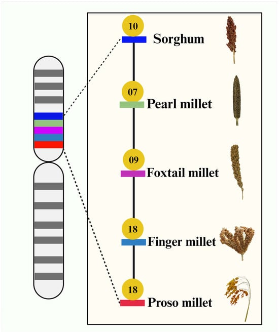 The first sorghum genome was released in 2009 at the chromosome level using the BTx623 genotype [48]. The assembled genome size was ~730 Mb with 229 scaffolds and 10 chromosomes. From the genome, they have identified more than 70,000 simple sequence repeat (SSR) markers and >34,000 annotated genes. Likewise, around 35,490 genes were identified from the genome sequence of the Rio genotype (Table 2). A total of 21 genome assemblies are currently available at NCBI, and many high-quality improved annotated genome sequences are available at the Phytozome database. The current version 5.1 is available in the Phytozome database (https://phytozome-next.jgi.doe.gov/info/Sbicolor_v5_1; accessed on 8 March 2024). After releasing the genome sequences of sorghum, several studies related to GWASs, transcriptomes, functional genomics, and molecular breeding have been extensively conducted. Sorghum has entered an exciting and fruitful era due to the abundant availability of genetic, genomic, and breeding resources for millet researchers. Hence, the genomic resources of sorghum can serve as a reference genome for all other millet species.