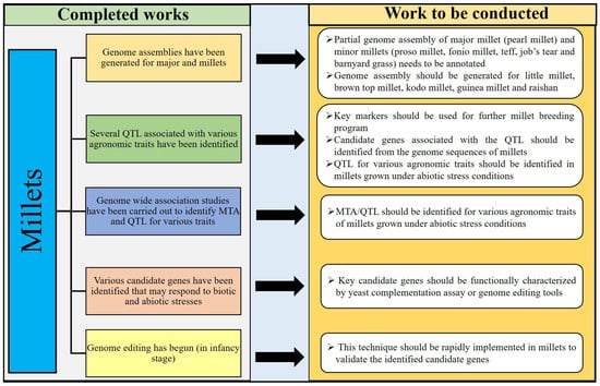 The availability of millet genomes facilitates the breeding and selection of millets, which are essential to support ongoing and future food security. However, researchers are trying to completely annotate the already available partial genome sequences of pearl millet, fonio millet, tef, job’s tear, proso millet, and barnyard millet (Figure 3). The complete annotation of pearl millet, fonio millet, tef, job’s tear, proso millet, and barnyard millet genome sequences will enable the rapid identification of the key genes that determine highly important traits in millets. Identifying markers and candidate genes from the available genome sequences would help millet improve against biotic and abiotic stresses. Also, this will allow for more efficient millet breeding by facilitating the selection of important traits. Genome sequences are not yet available for brown top millet, little millet, and kodo millet. Developing millet genome sequences for these three millets will support the improvement of these three millets. Genome editing is a famous tool in biotechnology to dissect the role of any candidate genes in any plants. Such novel techniques should be implemented in millets to dissect the already identified key genes related to biotic and abiotic stresses. The need for a rapid genetic improvement of millets is made more urgent by climate change, which demands new genotypes adapted to new and harsh environments. Maintaining millet genetic resources in seed banks and the conservation of the wild millet genotypes provide the genetic resources that are required for sustainable food production. More attention should be given to the collection and conservation of little millet, brown top millet, tef, fonio millet, job’s tear, kodo millet, proso millet, and barnyard millet, because most of the traditional germplasms of those millets have already disappeared from the world. Improving the nutritional contents of each millet through nutritional transporter gene manipulation may help enhance the nutritional availability in seeds of millets. In addition, several differentially expressed genes and molecular markers have already been identified for major and minor millets through transcriptomic resources. Hence, millet researchers can try to use the transcriptomic resources of millets for identifying candidate genes and developing molecular markers for those millets without complete annotated genome sequences.