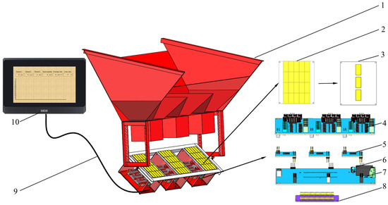 Structure composition diagram of the monitoring device: 1. collection hopper, 2. bidirectional array piezoelectric sensor, 3. vibration signal compensation device, 4. signal amplification module, 5. AD7606 analog-to-digital conversion module, 6. power supply circuit, 7. CAN communication module, 8. TMS320F28335 core processor module, 9. CAN bus, and 10. aerial screen.