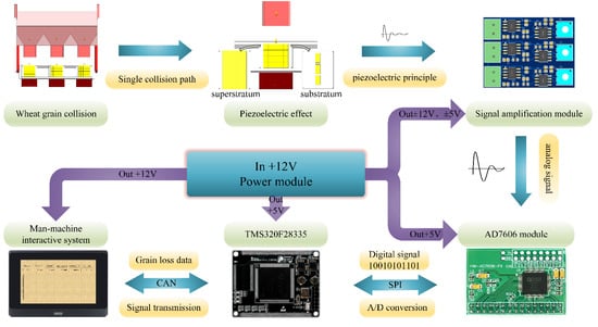 Figure 2 shows a schematic representation of the cleaning loss monitoring device. When the material collides with the bidirectional array piezoelectric sensor based on piezoelectric ceramics, the piezoelectric ceramics produce a piezoelectric effect output electrical signal, and the piezoelectric ceramics of the vibration signal compensation device on the back of the sensor can be subjected to mechanical vibration. The electrical signal generated by material collision and the electrical signal generated by vibration are amplified by the signal amplifier device simultaneously, and the mode converter comprising an AD7606 chip is collected and converted into the digital signal composed of binary numbers. Then, it is sent to the TMS320F28335 chip through SPI serial communication to compensate for the collision signal data and identify and count the grain to acquire the cleaning loss data. Then it is sent to the built-in man–machine interaction system of the serial screen through a CAN communication bus for data display and calculation of the cleaning loss rate.
