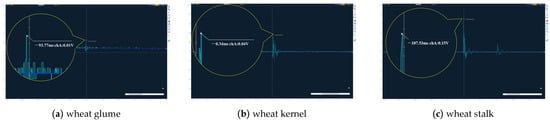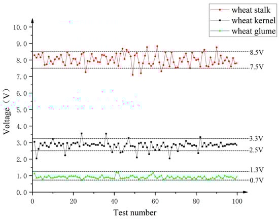 To validate the practicality of a piezoelectric sensor monomer as a grain collision detector, experiments were conducted where wheat grains, wheat stalks, and wheat glume shells were dropped from the same heights to collide with the sensor. The resulting output electrical signals are illustrated in Figure 5 [25]. The output signals of collision-sensitive units of wheat grain, wheat stem, and wheat glume were analyzed. Piezoelectric sensors can generate electrical signals when they are impacted by external forces. This observation is consistent with the behavior of piezoelectric ceramics, which generate a piezoelectric effect in response to external forces and produce an electrical signal. The peak values of the electrical signal output when different materials collide with the sensitive unit at the same height are then compared. It is found that the glume collision results in the smallest peak value, followed by the wheat grain collision, with the wheat stem collision producing the largest peak value; the obvious waveforms generated by the collision of each material appear, with a clear difference in the peak range of each waveform. Therefore, the piezoelectric sensor unit developed in the present research, made of piezoelectric ceramics and beryllium bronze, is used as a material for making grain-collision sensors.