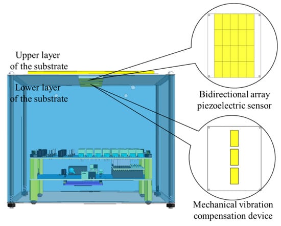Meanwhile, the monitoring device for wheat harvester grain cleaning loss needs to be installed at the tail of the harvester to monitor the grain cleaning loss. The piezoelectric sensor used in this study is affected by vibration, so it is necessary to reduce the influence of mechanical vibration on the piezoelectric sensor. To address this issue, a method of signal compensation was proposed [30]. The method aims to reduce the influence of mechanical vibration on the bidirectional array piezoelectric sensor, and the vibration signal compensation device is shown in Figure 6.