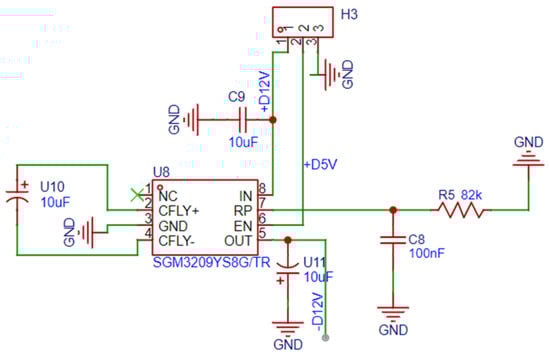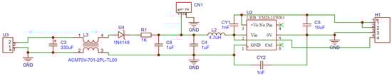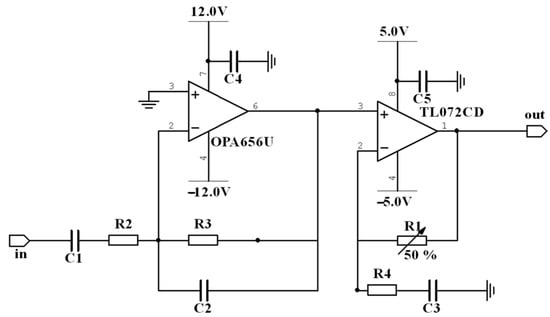 This signal-amplifying circuit uses the OPA656 chip to construct a first-stage amplifier circuit and the TL072 chip to form a second-stage amplifier. As depicted in Figure 7, both chips are powered by a positive and negative dual power supply. This configuration enhances the dynamic range of the operational amplifier, diminishes circuit noise, and augments the stability and reliability of the amplifier circuit. To modulate the gain (A) of the amplifier circuit, we have incorporated a potentiometer R1 into the design. Adjusting its resistance allows for precise control over the amplification factor, as shown in Formula (1). By adjusting the resistance value of R1, the grain collision signal can be amplified by 1 to 100 times.