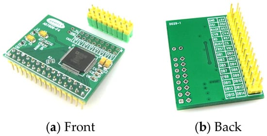 The analog output voltage signal derived from the piezoelectric ceramics used in this investigation must be converted to a digital format, a process that entails sampling, holding, quantizing, and encoding via a mode converter [32]. While the on-chip ADC capabilities of the DSP28335 are adequate for general applications and can fulfill most measurement needs, they are inadequate for the specific design criteria of this research. Additionally, the inherent ADC suffers from a subpar conversion rate, inferior accuracy, and a limited channel count. For these reasons, an external ADC has been selected for use in this study. The expanded ADC is centered around the AD7606 chip, manufactured by Analog Devices. This high-resolution 16-bit analog-to-digital converter provides a single device with eight simultaneous sampling channels, a maximum sampling rate of 200 kSps, and an input voltage range of either ±10 V or ±5 V. The AD7606 analog-to-digital conversion module selected in this study is shown in Figure 9.