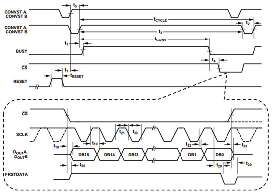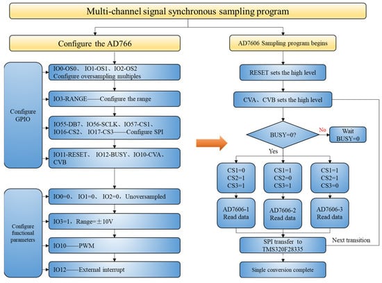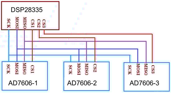 The SPI communication protocol is favored for its simplicity, ease of implementation, and clarity, as well as its support for full-duplex communication and decreased demand for transmission lines [33]. This minimizes the use of the chip’s GPIO ports and simplifies PCB wiring complexity. Consequently, this research selects the SPI mode for data exchange between the AD7606 module and the DSP28335. To specify, the PAR/SER/BYTE SEL pin is set high, while the DB15 pin is set low to engage the SPI serial interface mode. The connection architecture between the DSP28335 core processor and the AD7606 analog-to-digital converter is illustrated in Figure 11. The AD7606 converter designated for reading is chosen through the CS chip select signal managed by the DSP28335.