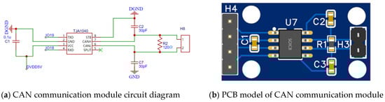The communication interface circuit serves as an essential conduit for information exchange between the collision signal processing system and the human–computer interaction system, playing an indispensable role in modern communication. Presently, the prevailing communication protocols encompass RS-232, RS-485, and CAN communication. The CAN communication bus is chosen to facilitate efficient information transfer between the material collision signal processing system and the human–computer interaction system. This selection is predicated upon a thorough evaluation of attributes such as adaptability in multi-node network configuration, real-time transmission capabilities, network architectural diversity, and system dependability, as delineated in Table 4.